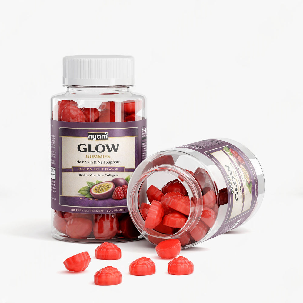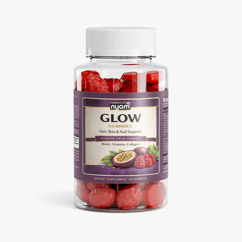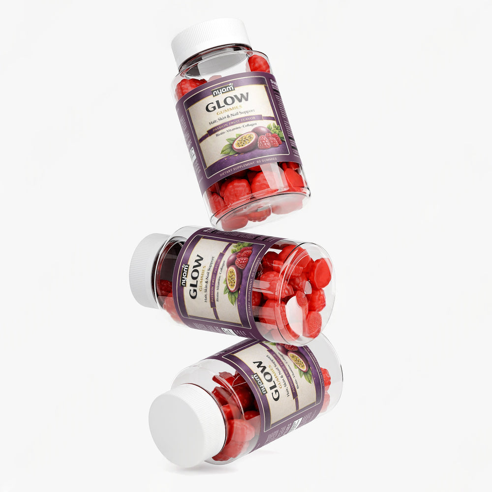 Discover the secret to vibrant beauty with Nyam Glow™ Hair, Skin & Nails Gummies. Formulated with a unique combination of essential vitamins and minerals, these gummies support your hair, skin, and nails from the inside out. Each delicious gummy contains Biotin, Vitamins A, C, D, and E, creating a nourishing blend that promotes your natural glow and beauty.