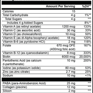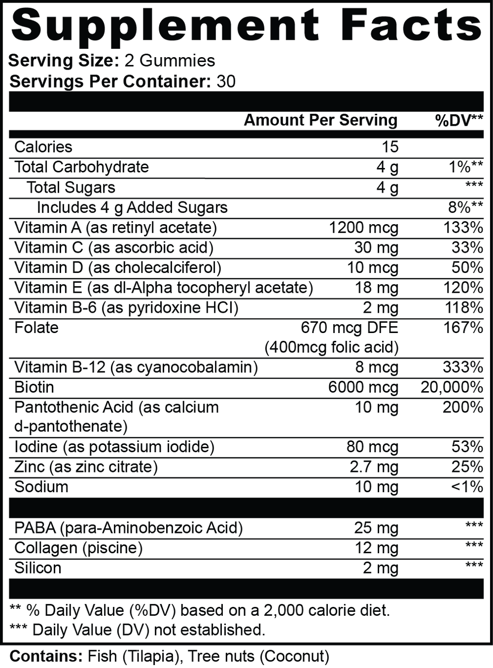 Ingredients: Vitamin A (as retinyl acetate), Vitamin C (as ascorbic acid), Vitamin D (as cholecalciferol), Vitamin E (as dl-Alpha tocopheryl acetate), Vitamin B-6 (as pyridoxine HCI), Folate, Vitamin B-12 (as cyanocobalamin), Biotin, Pantothenic Acid (as calcium d-pantothenate), Iodine (as potassium iodide), Zinc (as zinc citrate), PABA (para-Aminobenzoic Acid), Collagen (piscine), Silicon, Glucose syrup, Sugar, Glucose, Pectin, Citric acid, Sodium citrate, Passion fruit flavor, Vegetable oil (contains carnauba wax), Purple carrot juice concentrate.